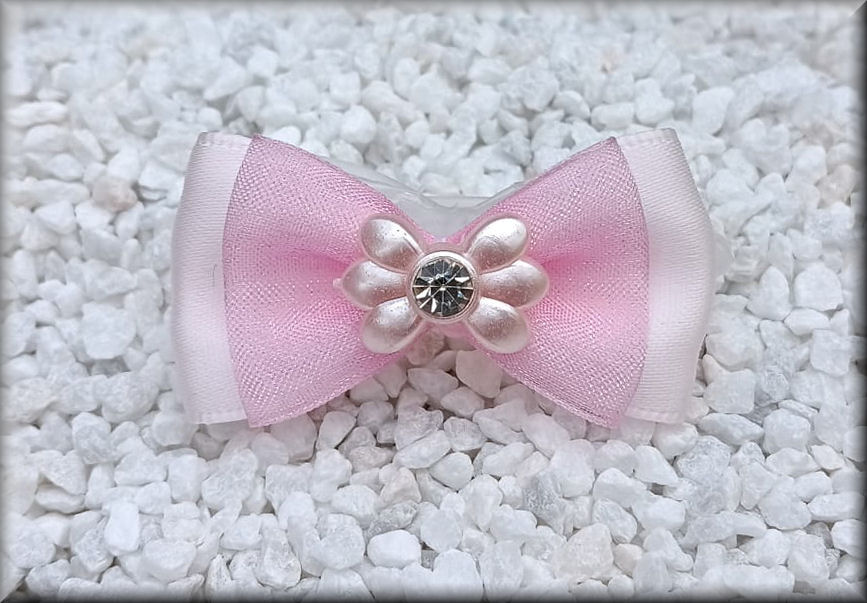 Die Schleife ist 5 cm und auf einer 4,5 cm Kunststoffspange (Schleifenform) befestigt.